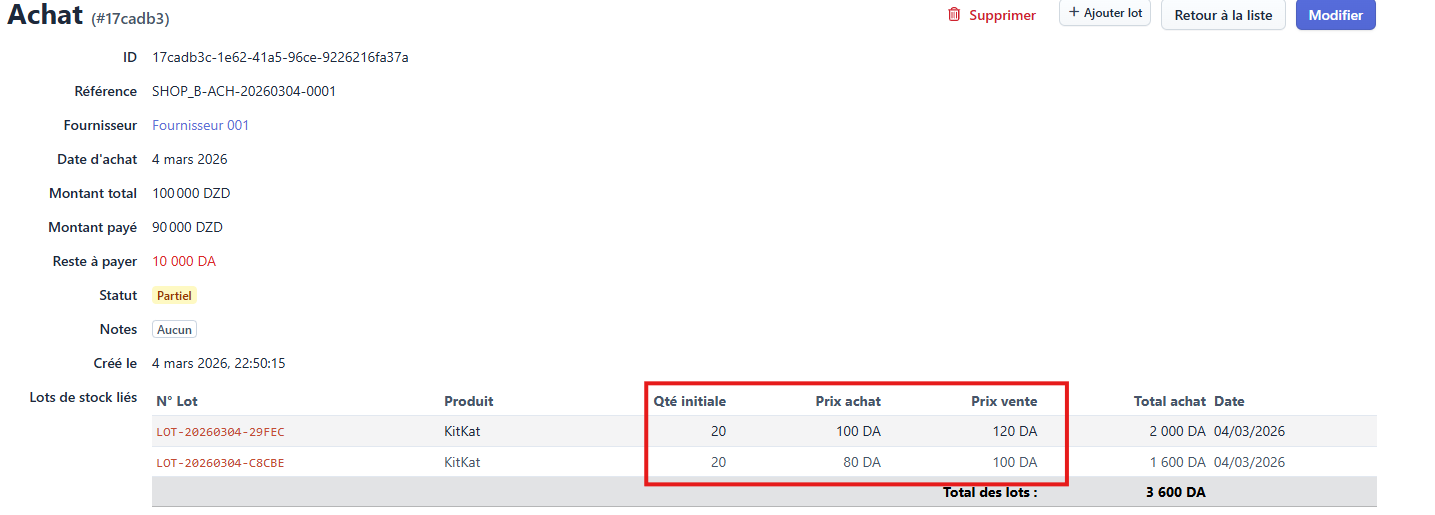 Sur l'achat SHOP_B-ACH-20260304-0001 j'ajoute un nouveau lot du même produit "KitKat" avec des prix d'achat et vente différents. On constate que le PMP et le prix de vente ne sont pas propagés. Le même comportement a été observé quand on créé ou on modifie un stock depuis l'onglet "Stocks par produit":