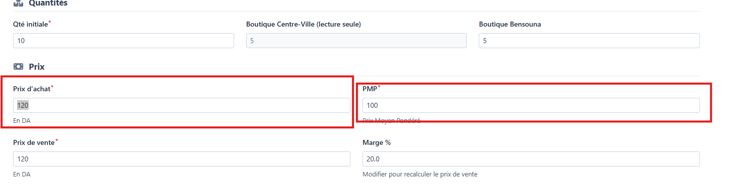 Quand je modifie manuellement le PMP et le prix de vente on constate que le calcul de la marge est incorrect:
